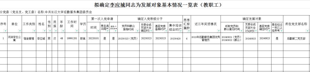 对经过一年以上培养教育和考察、基本具备党员条件的入党积极分子,经听取党小组、培养联系人、党员和群众意见,支部委员会讨论同意,报分党委备案后,拟确定李应城同志为发展对象,特在后勤范围内进行公示。