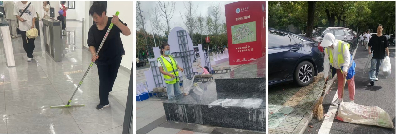 为迎接一万余人长大新主人,物业工作人员全面开展校园清扫、垃圾桶清洗、迎新点等重要区域保洁等工作。迎新期间,部分员工全天保洁,巡回作业,保障垃圾不落地。
